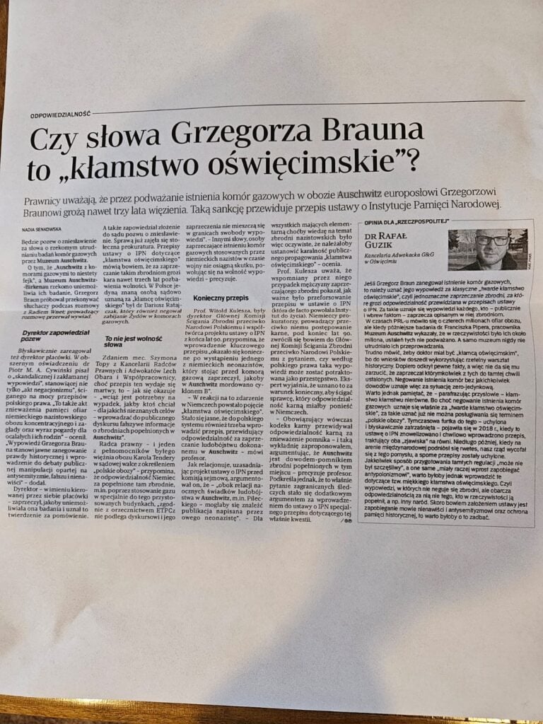 Swój komentarz adw. dr Rafał Guzik zawarł w wydaniu elektronicznym oraz papierowym „Rzeczpospolitej”. Link do artykuły jest dostępny tutaj: https://www.rp.pl/prawo-karne/art42691121-czy-slowa-grzegorza-brauna-o-komorach-gazowych-to-klamstwo-oswiecimskie-prawnicy-komentuja?utm_medium=Social&utm_source=Facebook#Echobox=1752299371